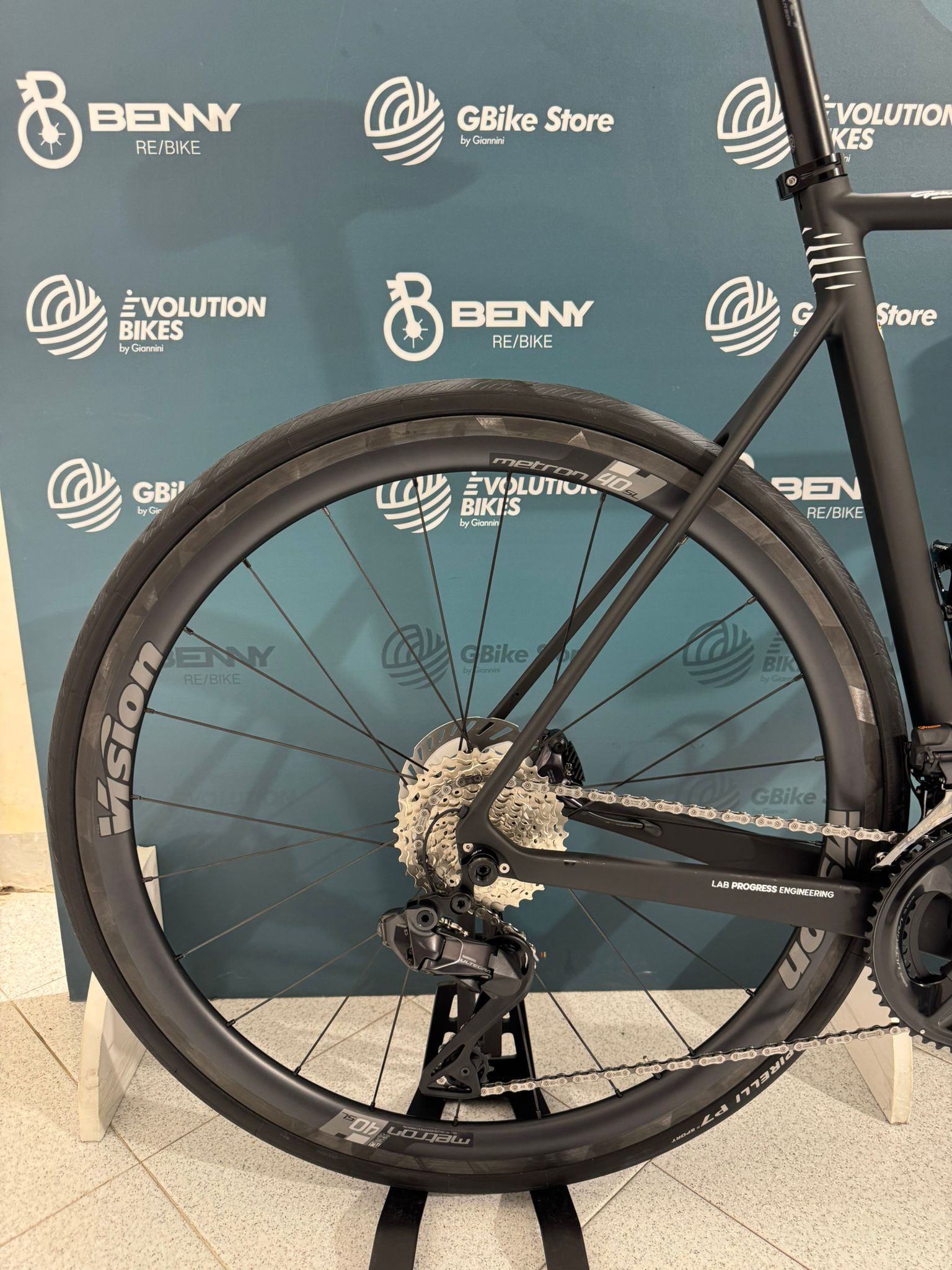 The frame is a T700 UD-HM carbon monocoque, with graphene and kevlar reinforcements in the points subject to greatest stress e aerodynamic profiles.
