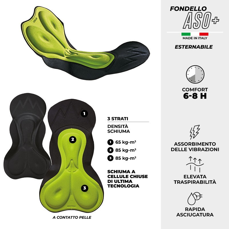 La salopette de cyclisme de Belike avec dos ASO 6H est faite avec des parcelles perforées et des épaisseurs différenciées pour garantir le cycliste et les motards Confort et transpiration maximum. Le dossier intégré garantit une excellente liberté de mouvement, une élasticité incroyable et Évitez les abrasions en raison du bord extérieur excessif. Le vêtement est sans coutures, sauf pour le cas intégré dans le pantalon, pour encourager la transpiration et assurer un bien-être maximum pendant L'activité.
